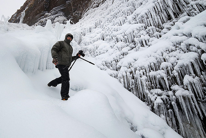 על קרח חלקלק לצד מפל ענק, צולם ע"י אלרואי דוד במהלך